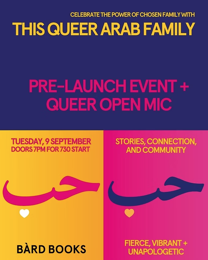 Join us at Bàrd Books on Tuesday, September 9, 2025, from 7:30pm for a special evening of stories, connection and community as we launch the much-anticipated anthology, This Queer Arab Family. Bàrd Books will be hosting a Queer Open Mic Night featuring readings from queer writers across the city. Expect moving prose, powerful poetry and joyful storytelling.